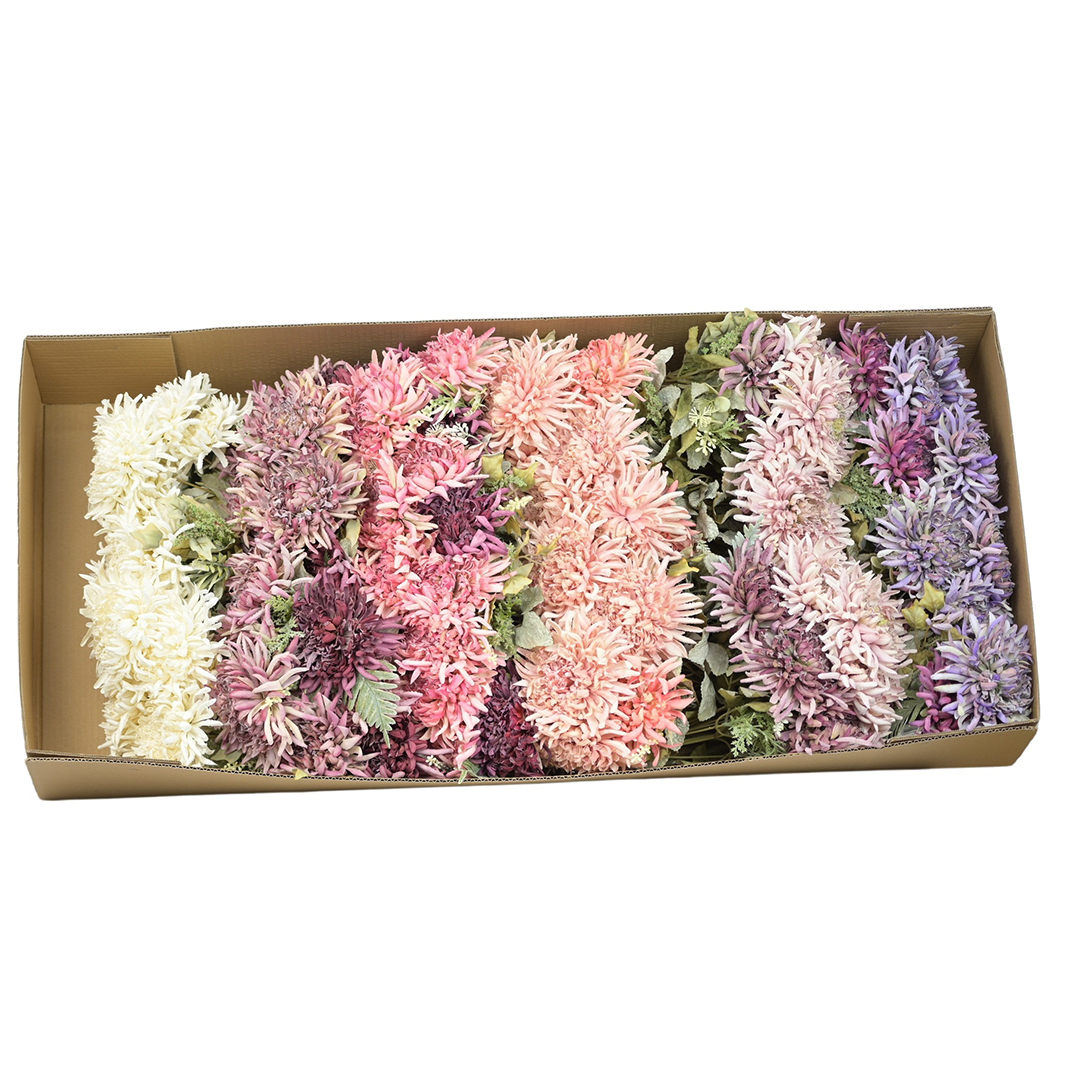 Karton bukietów chryzantem z dodatkami to wszechstronny zestaw, który otwiera szerokie możliwości przed florystami, dekoratorami wnętrz oraz osobami aranżującymi przestrzenie na potrzeby różnego rodzaju wydarzeń. W kartonie znajdują się 24 bukiety sztucznych chryzantem w sześciu starannie skomponowanych wariantach kolorystycznych: kremowym, różowym, różowo-fioletowym, fioletowym, brudnym fiolecie oraz fuksji – po 4 bukiety w każdym z tych kolorów.