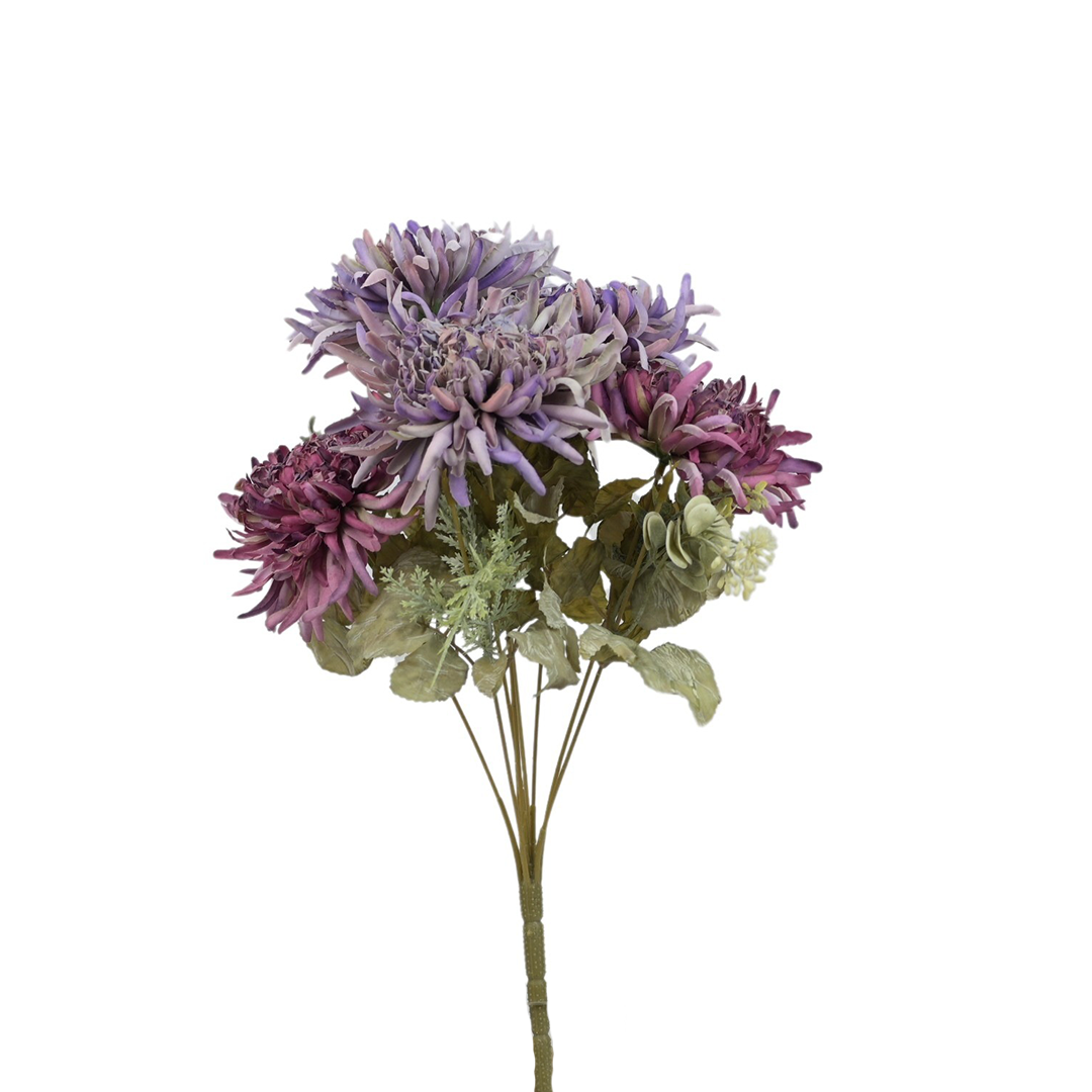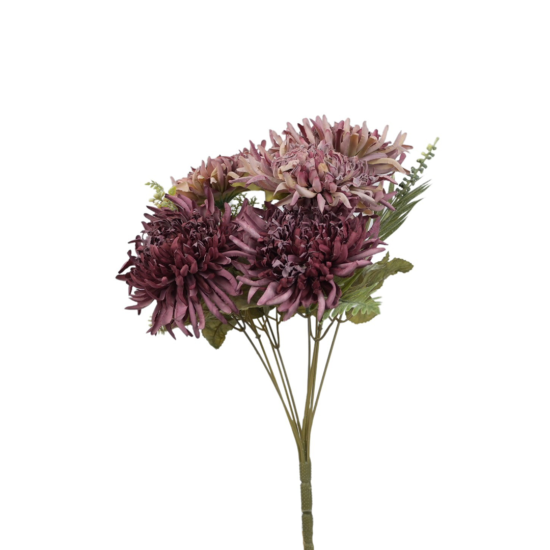 Uzupełnieniem każdego bukietu sztucznych chryzantem są zielone, plastyczne dodatki, które wiernie odwzorowują liście i roślinność towarzyszącą – dzięki temu kompozycja zyskuje wizualną głębię. Każdy bukiet z zestawu osadzony jest na giętkim, ale stabilnym trzonie, który umożliwia łatwe modelowanie kompozycji i swobodne dopasowanie jej do konkretnej aranżacji – zarówno przez doświadczonych florystów, jak i osoby dopiero rozpoczynające swoją przygodę z dekoracją.