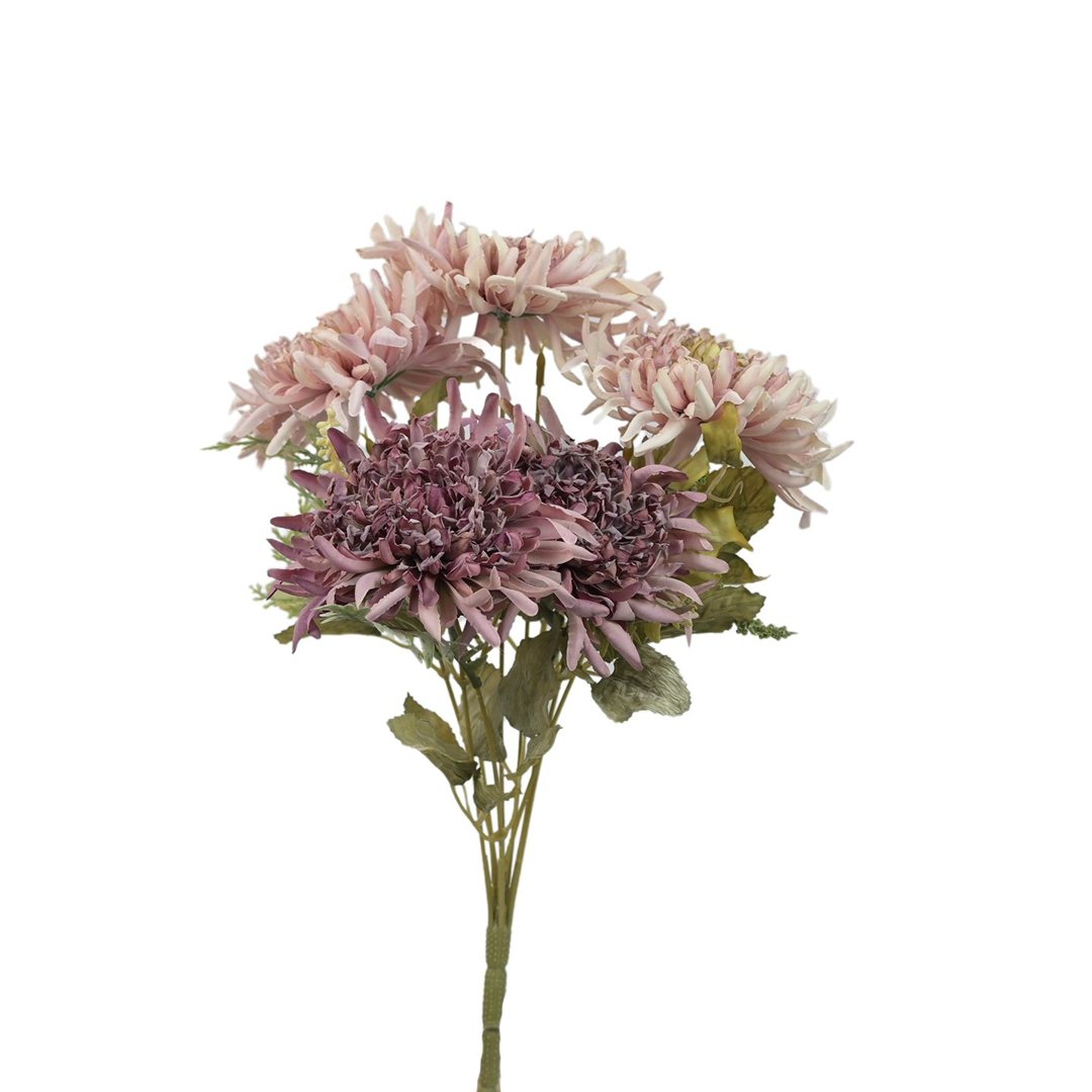Każdy z bukietów ma wysokość 40 cm i zawiera pięć efektownych kwiatów chryzantemy, wykonanych z wysokogatunkowej satyny. Realistycznie odwzorowane płatki sztucznej chryzantemy zachwycają detalem i subtelnym cieniowaniem – od delikatnych pastelowych tonów po bardziej nasycone, głębokie barwy. Zastosowane przejścia tonalne podkreślają trójwymiarowość kompozycji i dodają jej autentycznego, naturalnego wyglądu, idealnie imitując strukturę żywych kwiatów.
