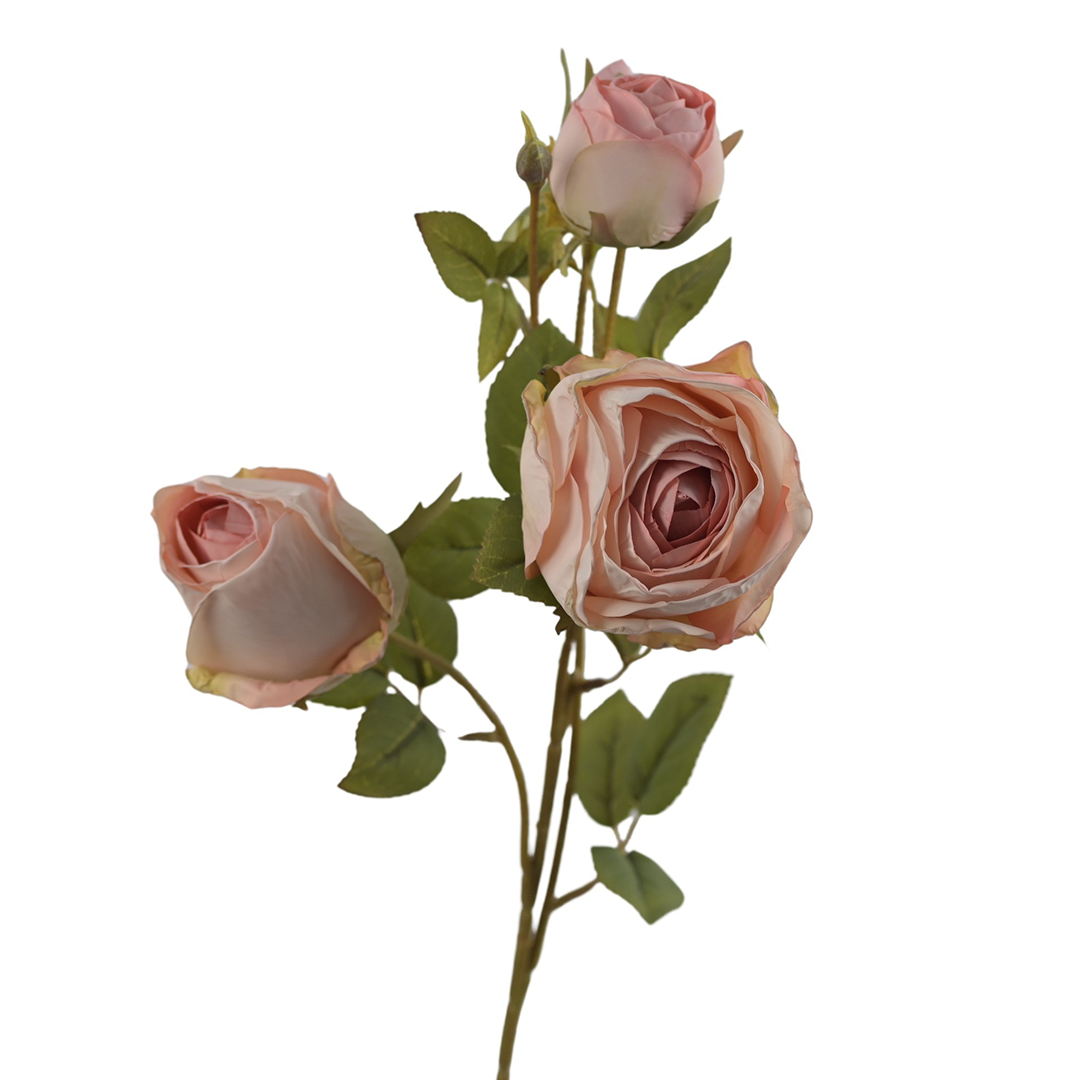 Sztuczna róża gałązkowa w kolorze jasnoróżowym prezentuje subtelną, świeżą barwę, która dodaje kompozycjom lekkości i elegancji. Gałązka o wysokości 65 cm zawiera trzy pełne kwiaty oraz dwa zamknięte pąki, dzięki czemu tworzy naturalny rytm rozkwitu widoczny w żywych kwiatach. Płatki zostały wykonane z wysokogatunkowej satyny, która wiernie odwzorowuje miękką fakturę kwiatu i zapewnia trwałość koloru w codziennym użytkowaniu. Liście i pędy wyróżniają się naturalnym odcieniem zieleni oraz subtelnym odwzorowaniem struktury, dzięki czemu cała gałązka zachowuje realistyczny, spójny charakter. Łodyga została wykonana w sposób umożliwiający swobodne formowanie – można ją lekko dogiąć, dopasować do naczynia lub kompozycji.
