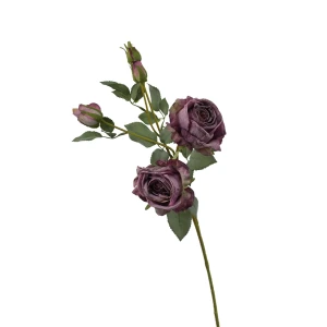Sztuczna róża składa się z dwóch w pełni rozwiniętych kwiatów oraz trzech zamkniętych pąków, co pozwala stworzyć kompozycję pełną dynamiki i wizualnej naturalności. Każdy element tej gałązki został zaprojektowany z dbałością o szczegóły, które naśladują wygląd żywych kwiatów. Płatki mają nieregularne, miękko wywinięte krawędzie, które nadają roślinie realistyczny wygląd. Liście wyróżniają się ząbkowaną formą i delikatnym cieniowaniem, co dodatkowo podkreśla botaniczny wygląd dekoracji. Kolorystyka całej róży opiera się na głębokim, przydymionym fiolecie, który płynnie przechodzi w zgaszone odcienie burgundu, bordo oraz chłodnej zieleni. Taka paleta barw nadaje kompozycji efekt kwiatów lekko podsuszonych, emanujących melancholijnym, ponadczasowym urokiem.