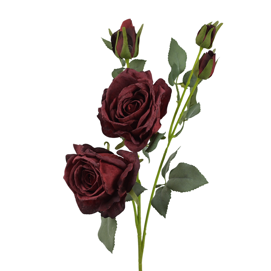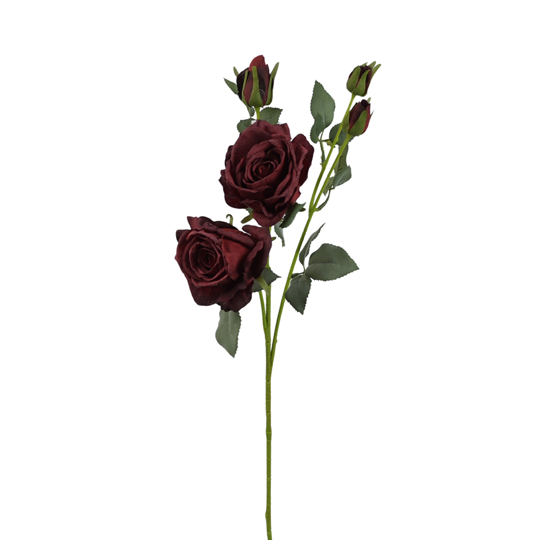 Suszona róża gałązkowa w czerwonym kolorze o wysokości 68 cm stanowi trwały element wykorzystywany w kompozycjach florystycznych. Na gałązce znajdują się trzy w pełni rozwinięte kwiaty oraz dwa zamknięte pąki, dzięki czemu całość wygląda naturalnie i zachowuje proporcje spotykane w suszonych roślinach. Płatki wykonano z satyny o matowym, lekko przygaszonym wykończeniu, które dobrze oddaje charakter suszonej róży. Łodyga została wzmocniona tworzywem, co zapewnia stabilność i umożliwia swobodne wyginanie oraz dopasowanie gałązki do konkretnej aranżacji.