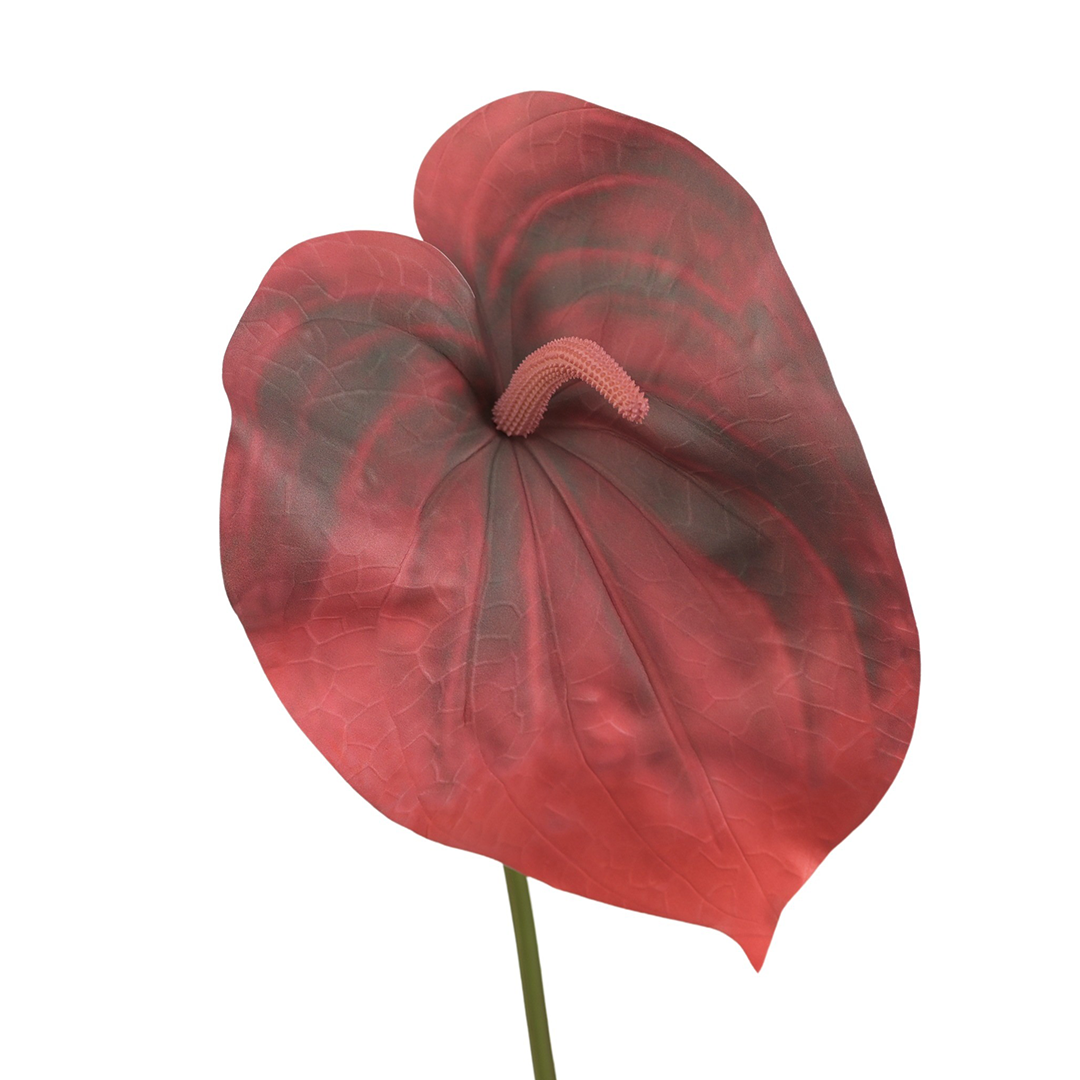Centralnie osadzony kolbowy kwiatostan w przygaszonym, różowym odcieniu wyraźnie odcina się od tła i stanowi punkt skupienia, który zamyka kompozycję wizualnie. Długi, prosty pęd pozwala swobodnie wykorzystać sztuczne anturium w wyższych aranżacjach, bukietach oraz dekoracjach przestrzennych.