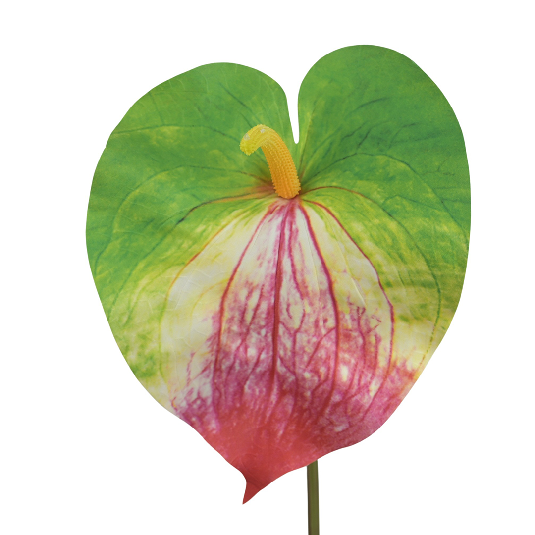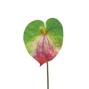 Sztuczne anturium w kolorze zielono-czerwonym o długości 86 cm ma szeroki płatek o wyraźnym, sercowatym kształcie z zaznaczonym wcięciem w górnej części i zwężeniem u dołu. Centralnie osadzona kolba w żółtym odcieniu jest lekko wygięta i wyraźnie oddziela się od płatka.
