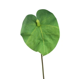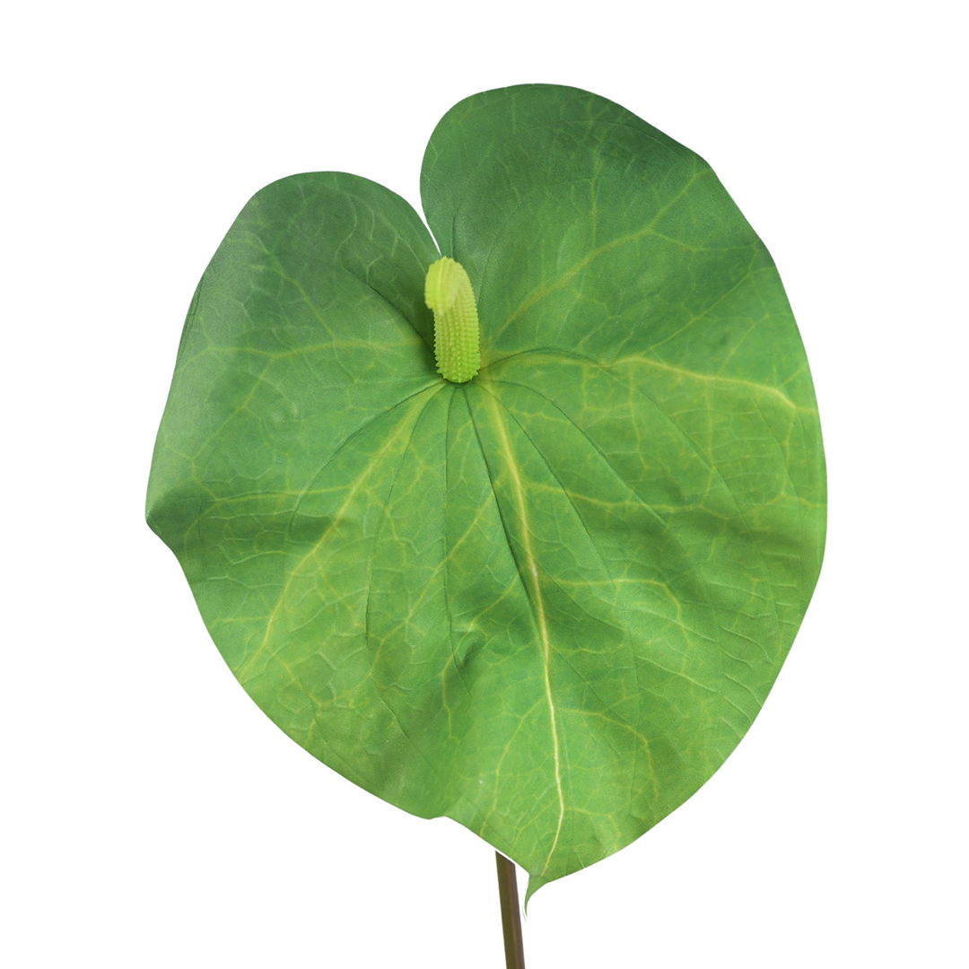 Zielone anturium o długości 86 cm ma duży, pojedynczy płatek o sercowatym kształcie z wyraźnym wcięciem w górnej części i zwężeniem u dołu. Krawędź płatka nie jest idealnie równa, co nadaje całości bardziej naturalny wygląd.