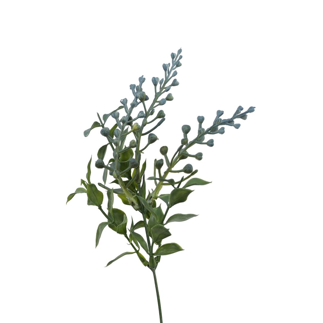 Każda gałązka została pokryta drobnymi, zamkniętymi jasnoniebieskimi pąkami oraz ozdobiona dekoracyjnymi liśćmi o charakterystycznym sercowatym kształcie. Naturalistyczna forma, matowe wykończenie i odpowiednio dobrana kolorystyka sprawiają, że sztuczna gałązka do złudzenia przypomina żywą roślinę.