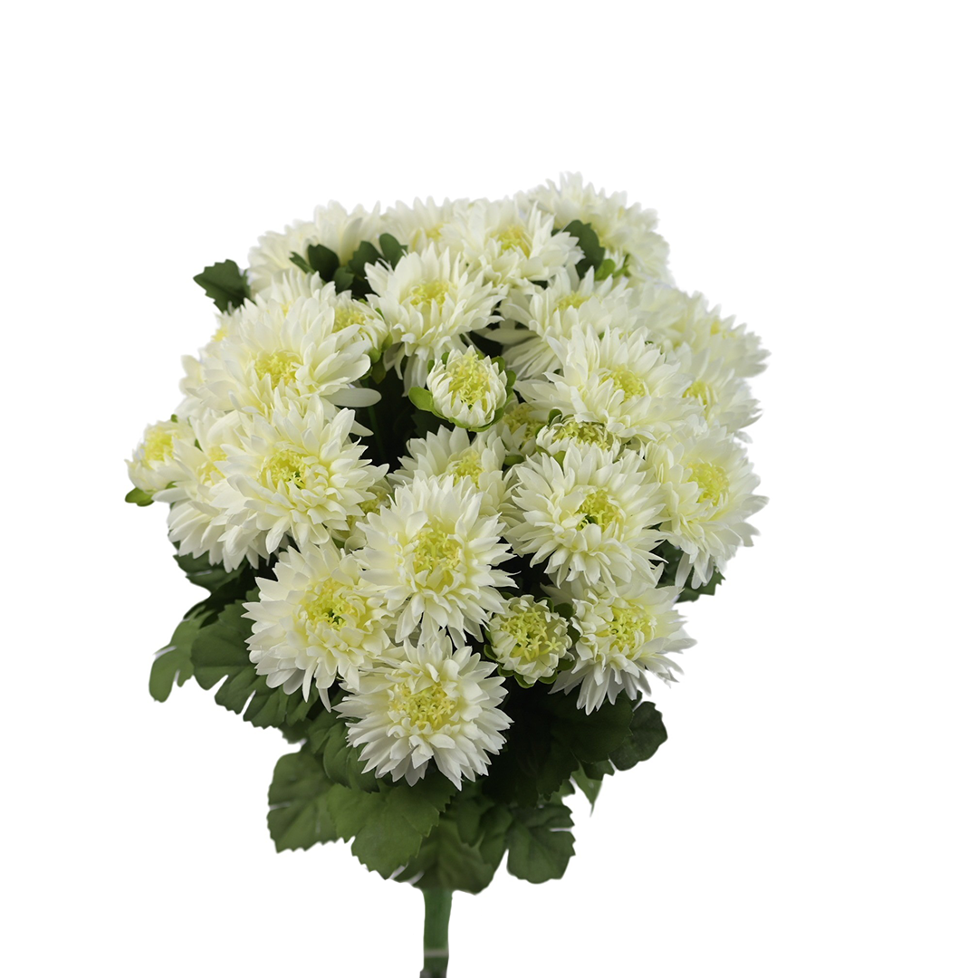 Bukiet sztucznych astrów w odcieniu klasycznej bieli to dopracowana kompozycja o wysokości 40 cm, która zachwyca naturalnym wyglądem i dekoracyjną formą. Bukiet zawiera 24 w pełni rozwinięte główki kwiatowe oraz 12 pąków, które wprowadzają naturalne zróżnicowanie i nadają kompozycji lekkości. Każda główka została wykonana z wysokogatunkowej satyny, dzięki czemu płatki delikatnie połyskują i miękko układają się wokół kremowo-żółtego środka. Precyzyjnie ukształtowane płatki tworzą wielowarstwowe rozety o lekko postrzępionej strukturze, a gęste, ząbkowane liście w intensywnie zielonym kolorze stanowią dla nich efektowne tło, podkreślając realistyczny wygląd bukietu.