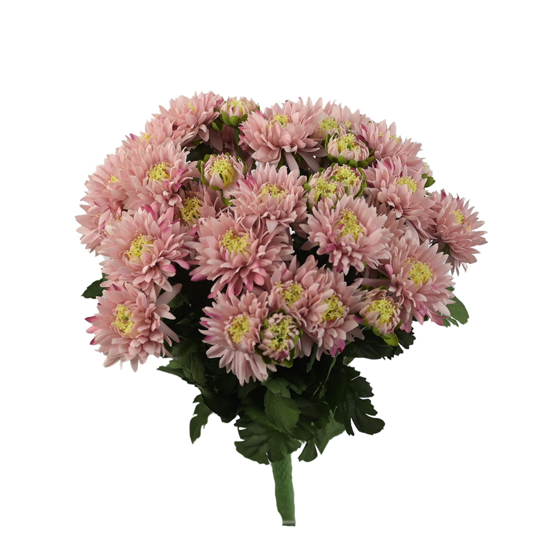 Każdy bukiet sztucznych astrów składa się z 24 rozwiniętych kwiatów i 12 drobnych pąków, co pozwala uzyskać naturalny efekt zróżnicowanej struktury, podobny do świeżo ułożonych wiązanek z żywych kwiatów. Poszczególne główki kwiatowe mają kulisty, zwarty kształt, a wielowarstwowe płatki satynowe układają się gęsto, tworząc pełne, dekoracyjne rozety. Subtelnie postrzępione krawędzie płatków podkreślają realistyczny wygląd całej kompozycji, natomiast jasnozielone środki wprowadzają delikatny kontrast, który nadaje całości lekkości.