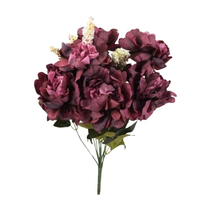 Bukiet piwonii w kolorze bordowym o wysokości 47 cm stanowi element dekoracyjny składający się z sześciu pełnych główek piwonii oraz drobnych dodatków, które razem tworzą spójną kompozycję kwiatową.