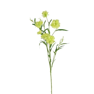 Sztuczny drobny gałązkowy goździk w kolorze zielonym o wysokości 72 cm to unikatowa dekoracja, która wprowadza do wnętrza odświeżający akcent natury. Pojedyncza gałązka składa się z sześciu drobnych kwiatów, precyzyjnie wykonanych z satyny, która nadaje im subtelny blask i miękką teksturę, wiernie oddając naturalny wygląd rośliny. Zielony odcień płatków harmonizuje z realistycznie odwzorowaną łodygą i delikatnymi listkami, tworząc spójną i estetyczną kompozycję.